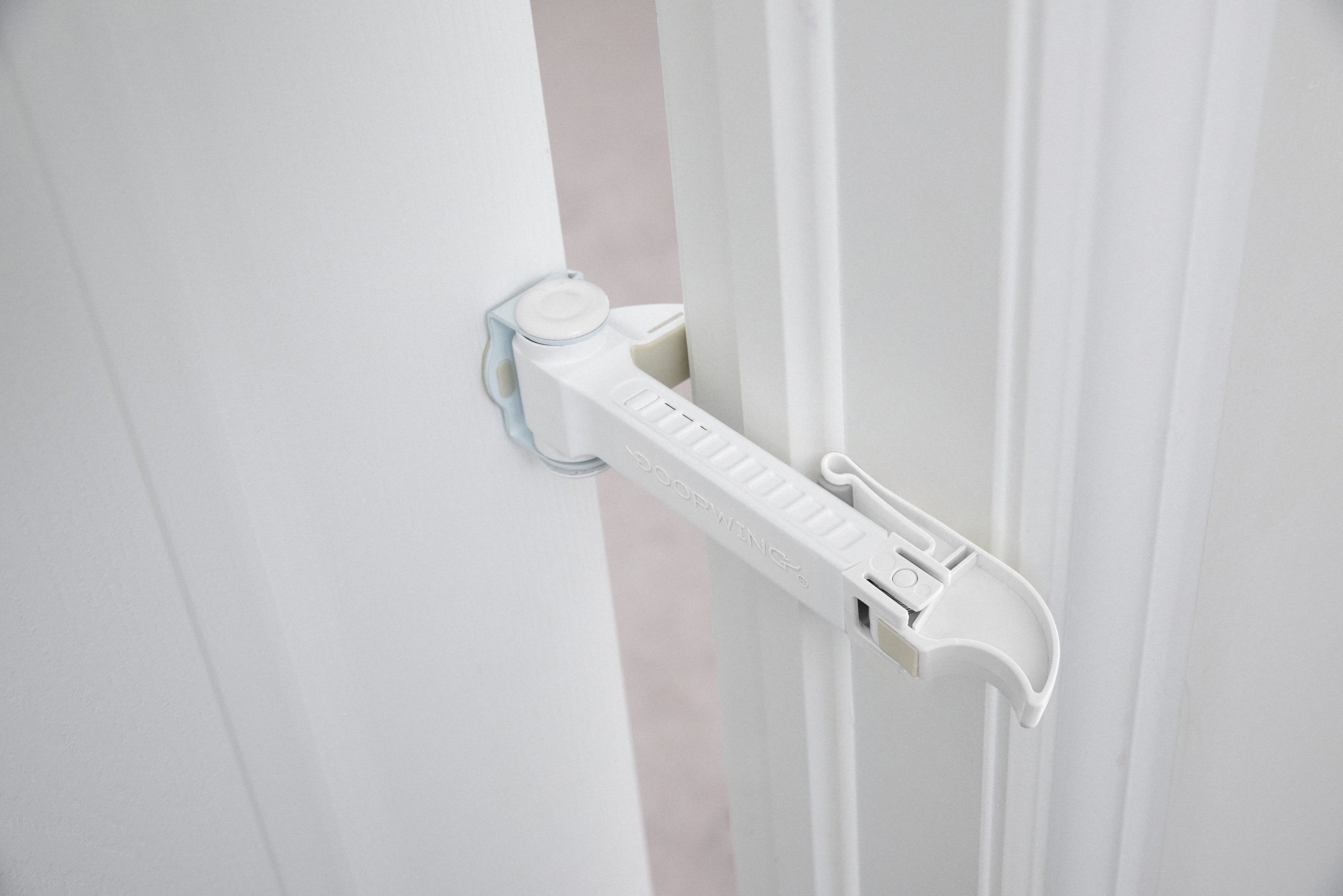 DOORWING secures doors in a slightly open position (1.5 inch gap), just enough to protect hands and tails from door slams, let fresh air through and keep babies, toddlers, cats and dogs out of unsafe areas.
